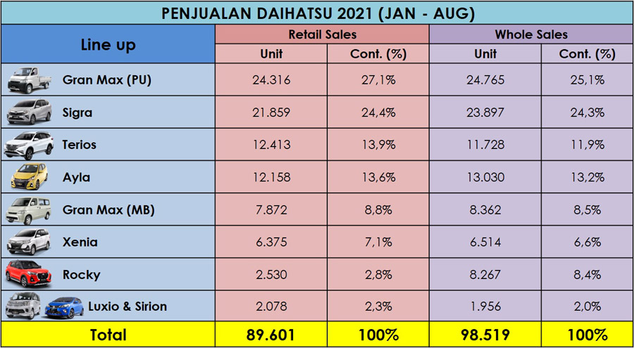 Selain capaian total, penjualan Daihatsu secara bulanan juga mengalami kenaikan dibandingkan bulan sebelumnya. Pada Agustus 2021, retail sales Daihatsu 12.199 unit, naik sebesar 20% dibandingkan Juli 2021 lalu, serta kenaikan wholesales pada periode yang sama sebanyak 14.408 unit, atau naik 55,2% dibandingkan bulan sebelumnya.