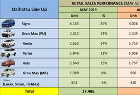 Secara volume dan kontribusi model, penjualan ritel Daihatsu tetap didominasi oleh top 3 model, seperti Sigra sebanyak 18.069 unit, atau berkontribusi 24,5%; disusul Gran Max PU (Pick Up) sebanyak 16.954 unit (23,0%); dan Xenia dengan raihan 9.910 unit (13,4%).